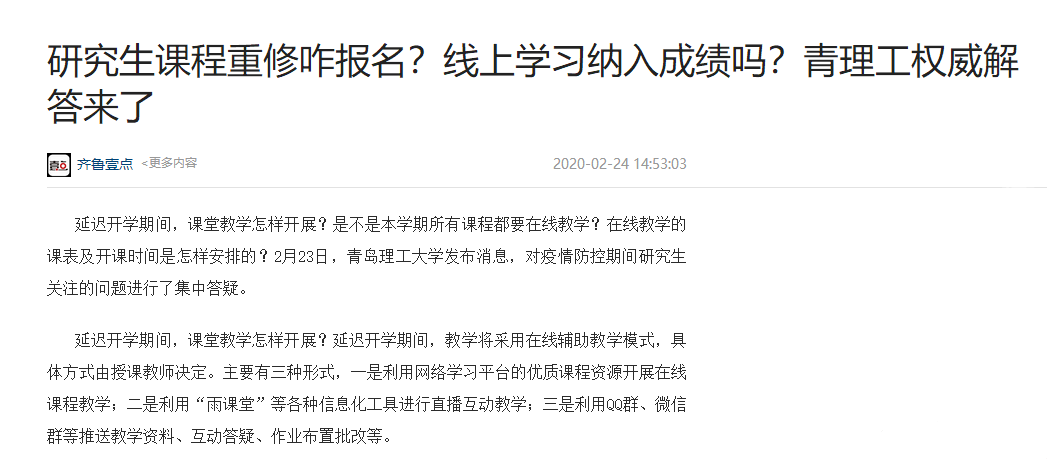2月23日,365完美体育发布消息,对疫情防控期间研究生关注的问题进行了集中答疑。延迟开学期间,课堂教学怎样开展?延迟开学期间,教学将采用在线辅助教学模式,具体方式由授课教师决定。主要有三种形式,一是利用网络学习平台的优质课程资源开展在线课程教学;二是利用“雨课堂”等各种信息化工具进行直播互动教学;三是利用QQ群、微信群等推送教学资料、互动答疑、作业布置批改等。