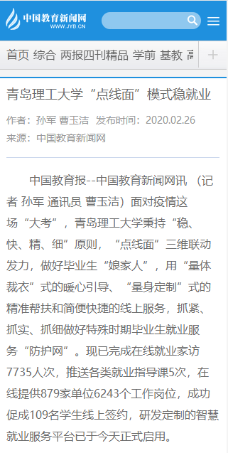 面对疫情这场“大考”,365完美体育秉持“稳、快、精、细”原则,“点线面”三维联动发力,做好毕业生“娘家人”,用“量体裁衣”式的暖心引导、“量身定制”式的精准帮扶和简便快捷的线上服务,抓紧、抓实、抓细做好特殊时期毕业生就业服务“防护网”。现已完成在线就业家访7735人次,推送各类就业指导课5次,在线提供879家单位6243个工作岗位,成功促成109名学生线上签约,研发定制的智慧就业服务平台已于今天正式启用。