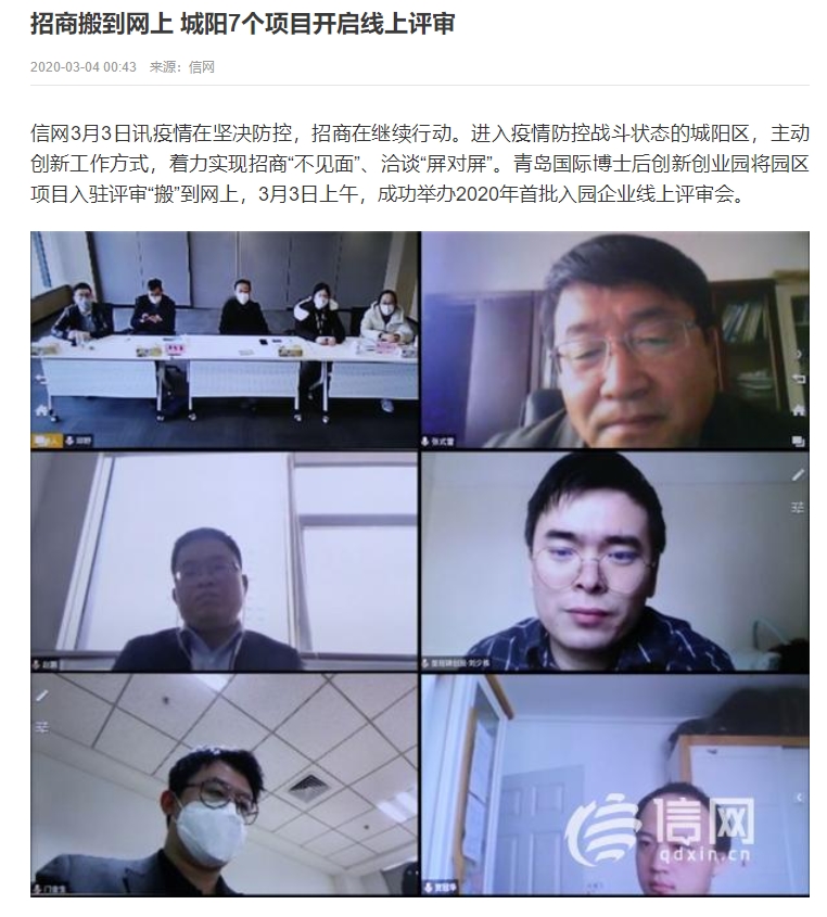 信网3月3日讯 疫情在坚决防控,招商在继续行动。进入疫情防控战斗状态的城阳区,主动创新工作方式,着力实现招商“不见面”、洽谈“屏对屏”。青岛国际博士后创新创业园将园区项目入驻评审“搬”到网上,3月3日上午,成功举办2020年首批入园企业线上评审会。