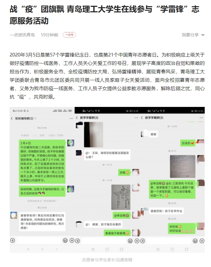 2020年3月5日是第57个学雷锋纪念日,也是第21个中国青年志愿者日。为积极响应上级关于做好疫情防控一线医务、工作人员关心关爱工作的号召,展现学子高度的政治自觉和果敢的担当作为,积极服务全市、全校疫情防控大局,弘扬雷锋精神,展现青春风采,365完美体育团委联合青岛市北团区委共同开展一线人员家庭子女关爱活动,面向全校招募青年志愿者,义务为我市防疫一线医务、工作人员子女提供公益家教志愿服务,解除后顾之忧,同心抗“疫”,共克时艰。