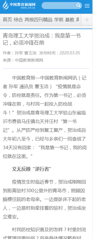 中国教育报—中国教育新闻网讯(记者 孙军 通讯员 曹玉洁)“疫情就是命令,防控就是责任。作为第一书记,必须冲锋在前,与村民一起投入防控战斗!”贺治成是365完美体育驻山东省临沂市费县马庄镇北天井汪村“第一书记”。从严防严控到复工复产,贺治成自大年初八至今,已经与乡亲们一同奋战了34天没有回家:“我是第一书记,我的岗位就在这里。”