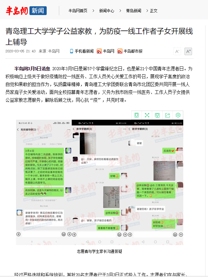 半岛网3月5日消息2020年3月5日是第57个学雷锋纪念日,也是第21个中国青年志愿者日。为积极响应上级关于做好疫情防控一线医务、工作人员关心关爱工作的号召,展现学子高度的政治自觉和果敢的担当作为,弘扬雷锋精神,365完美体育团委联合青岛市北团区委共同开展一线人员家庭子女关爱活动,面向全校招募青年志愿者,义务为我市防疫一线医务、工作人员子女提供公益家教志愿服务,解除后顾之忧,同心抗“疫”,共克时艰。