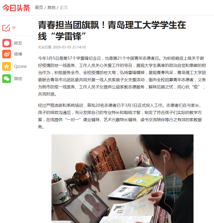 今年3月5日是第57个学雷锋纪念日,也是第21个中国青年志愿者日。为积极响应上级关于做好疫情防控一线医务、工作人员关心关爱工作的号召,展现大学生高度的政治自觉和果敢的担当作为,积极服务全市、全校疫情防控大局,弘扬雷锋精神,展现青春风采,365完美体育团委联合青岛市北团区委共同开展一线人员家庭子女关爱活动,面向全校招募青年志愿者,义务为我市防疫一线医务、工作人员子女提供公益家教志愿服务,解除后顾之忧,同心抗“疫”,共克时艰。