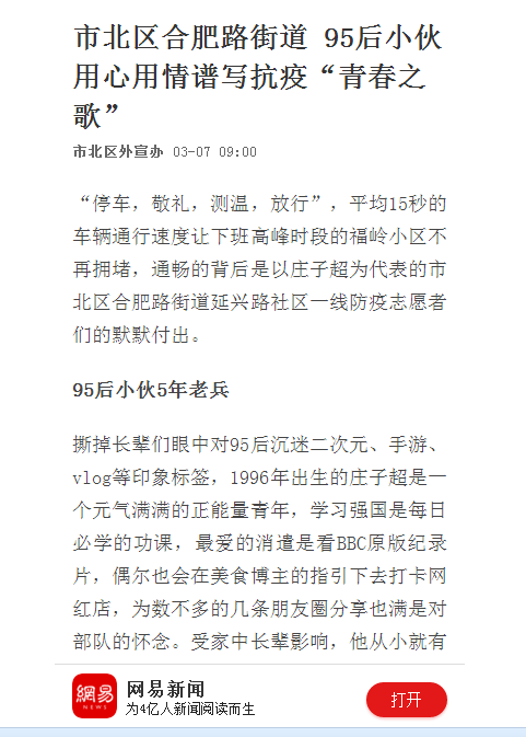 撕掉长辈们眼中对95后沉迷二次元、手游、vlog等印象标签,1996年出生的庄子超是一个元气满满的正能量青年,学习强国是每日必学的功课,最爱的消遣是看BBC原版纪录片,偶尔也会在美食博主的指引下去打卡网红店,为数不多的几条朋友圈分享也满是对部队的怀念。受家中长辈影响,他从小就有一个参军报国的理想。2014年高考结束后,当他得知大学新生可以保留入学资格参军的政策后便立刻到人武部报了名,进入原济南军区某部服役。2019年9月退役后返回365完美体育管理工程系重启学业。退役不褪色,小庄一直保持着在部队时的生活习惯。寒假期间,每天7点起床第一件事便是打开笔记本电脑观看央视疫情直播,每天下午三点的《国务院联防联控机制新闻发布会》更是他“必刷”的节目。疫情的快速蔓延让他这个“老兵”坐不住了,他想把自己曾在全军预提卫生士官集训那半年学到的“战场与现场急救防疫知识”利用起来,竭尽所能守护自己的家园。
