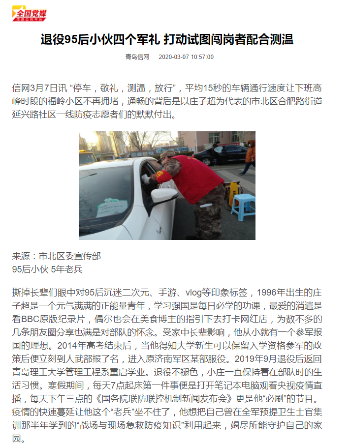 为做好社区疫情防控,小庄值岗的开放式小区实行临时封闭管理,只保留一个出入口。为提高小区车辆通行速度,他坚持使用规范的交警手势引导车辆接受检查。小庄坦言:“我以前在部队干过警勤,深知这个手势的好处,嘈杂的室外环境会影响言语沟通效率,用标准手势驾驶员一看就明白,可以提高通行速度,为了能早点回家大家都很配合”。但是小庄说的大家也有例外。2月23日下午,一位女司机拒绝体温检测硬闯门岗。小庄向其行了一个军礼并说“请您配合”。该女司机不客气地表示:“就是给父母送个饭,测什么测!”便继续往里进。小庄又向她行了一个军礼并说“请您配合”。闯关的女司机赌气道:“你算什么东西,我就不测,你能把我咋地!”还是不配合测温执意要进。小庄挡在她面前又陆续向她行了2个军礼,小庄的执著最终打动了该女子并配合进行了测温。测温结束后小庄的一句“感谢您的配合”,让周围路过的百姓向他竖起了大拇哥。小庄说:“我理解那位女士刚才不理智的举动,疫情让人心理焦虑,许多人需要一个情感宣泄的出口,当兵的不怕流汗流血,更不怕受委屈。”疫情期间,这样的情况不是个例。街道、社区作为疫情防控一线,坚守在防控岗上的党员干部、志愿者们,在走街串巷落实防疫宣传、人员排查、清洁消毒、登记测温等工作中,经常会遇到这样那样的不理解和质疑的声音。面对这些,志愿者们选择了像小庄一样,耐心细致向居民进行沟通、解释和劝说,疫情不退,志愿者就不退。