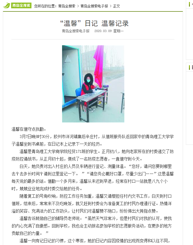 温馨是365完美体育商学院经贸171班的学生。正月初八,她向老家所在的村委递交了防疫防控请战书,从正月初十起,便成了一名防疫志愿者,一直值守到今天。