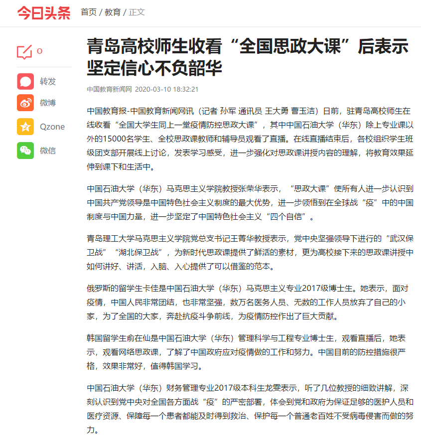 中国教育报-中国教育新闻网讯(记者 孙军 通讯员 王大勇 曹玉洁)日前,驻青岛高校师生在线收看“全国大学生同上一堂疫情防控思政大课”,其中中国石油大学(华东)除上专业课以外的15000名学生、全校思政课教师和辅导员观看了直播。在线直播结束后,各校组织学生班级团支部开展线上讨论,发表学习感受,进一步强化对思政课讲授内容的理解,将教育效果延伸到课下和生活中。