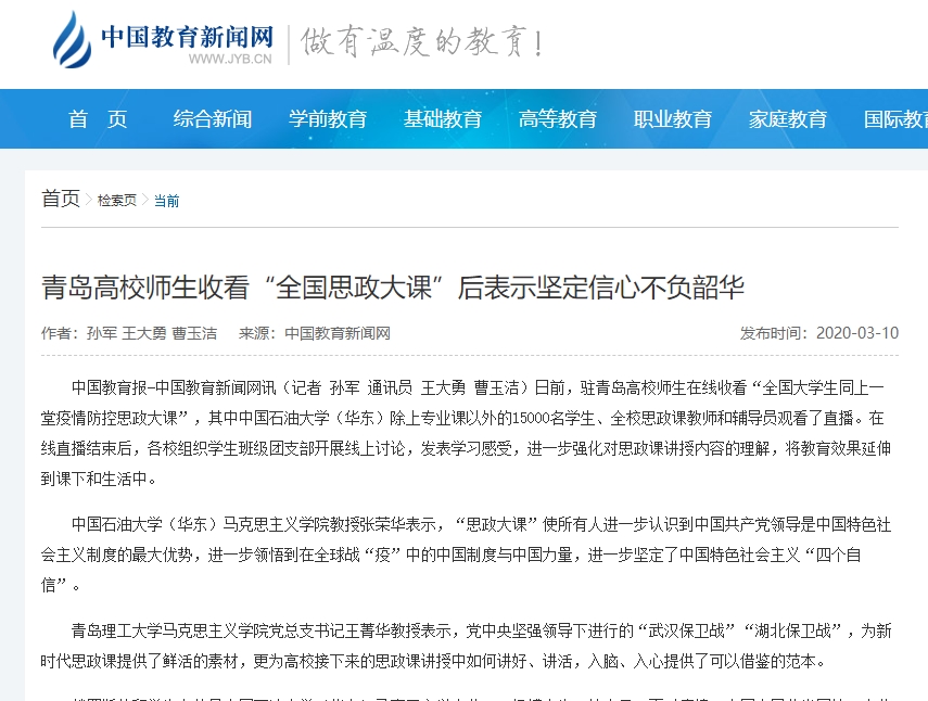 中国教育报-中国教育新闻网讯(记者 孙军 通讯员 王大勇 曹玉洁)日前,驻青岛高校师生在线收看“全国大学生同上一堂疫情防控思政大课”,其中中国石油大学(华东)除上专业课以外的15000名学生、全校思政课教师和辅导员观看了直播。在线直播结束后,各校组织学生班级团支部开展线上讨论,发表学习感受,进一步强化对思政课讲授内容的理解,将教育效果延伸到课下和生活中。
