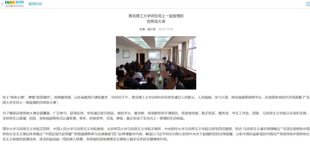 同上“思政大课”,厚植“家国情怀”。按照教育部、山东省教育厅通知要求,3月9日下午,365完美体育24800多名师生通过人民智云、人民视频、学习大国、咪咕视频等网络平台,在祖国各地同步在线观看了“全国大学生同上一堂疫情防控思政大课”。