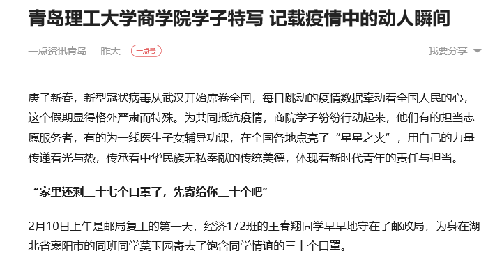 2月初正处在疫情爆发的时期,家在山东淄博的王春翔在了解到莫玉园家中急缺口罩的情况后,就立即把家中仅存的30个未开封的口罩寄了过去。为莫玉园寄过去三十个口罩后,王春翔家只剩七个口罩了。但王春翔却说,自己家中口罩不够没关系,山东地区不比湖北,自己会避免不必要的出门,湖北地区疫情较重、物资紧缺,比自己更需要口罩。王春翔先人后己的无私精神不仅帮助了同学,传递出的大爱和友善更影响着整个商学院,在学院掀起了口罩互助行动的良好风气。