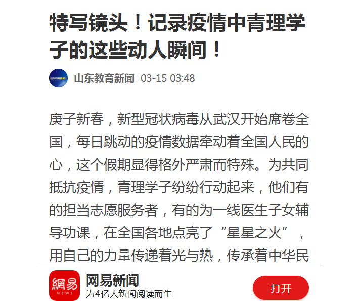 庚子新春,新型冠状病毒从武汉开始席卷全国,每日跳动的疫情数据牵动着全国人民的心,这个假期显得格外严肃而特殊。为共同抵抗疫情,青理学子纷纷行动起来,他们有的担当志愿服务者,有的为一线医生子女辅导功课,在全国各地点亮了“星星之火”,用自己的力量传递着光与热,传承着中华民族无私奉献的传统美德,体现着新时代青年的责任与担当。
