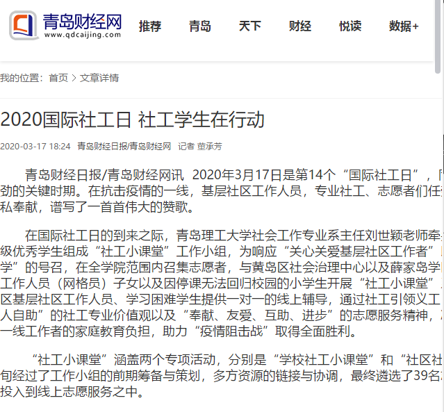 青岛财经日报/青岛财经网讯 2020年3月17日是第14个“国际社工日”,同时也是疫情防控最吃劲的关键时期。在抗击疫情的一线,基层社区工作人员,专业社工、志愿者们任劳任怨,冲锋在前,无私奉献,谱写了一首首伟大的赞歌。