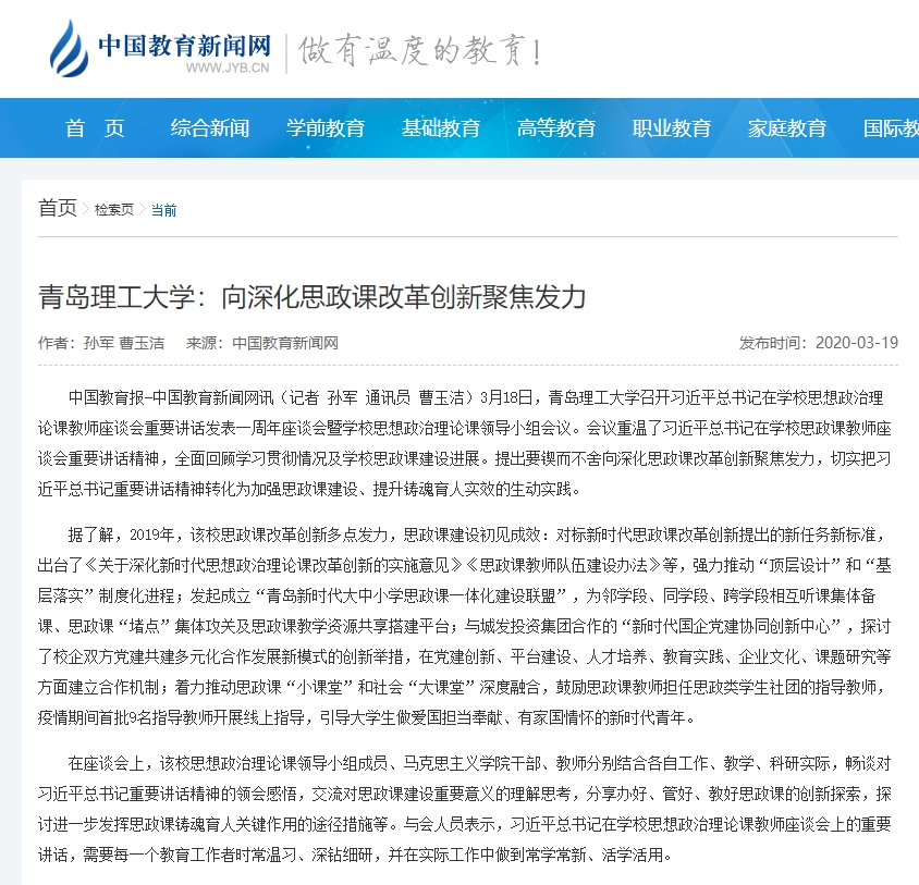 据了解,2019年,该校思政课改革创新多点发力,思政课建设初见成效:对标新时代思政课改革创新提出的新任务新标准,出台了《关于深化新时代思想政治理论课改革创新的实施意见》《思政课教师队伍建设办法》等,强力推动“顶层设计”和“基层落实”制度化进程;发起成立“青岛新时代大中小学思政课一体化建设联盟”,为邻学段、同学段、跨学段相互听课集体备课、思政课“堵点”集体攻关及思政课教学资源共享搭建平台;与城发投资集团合作的“新时代国企党建协同创新中心”,探讨了校企双方党建共建多元化合作发展新模式的创新举措,在党建创新、平台建设、人才培养、教育实践、企业文化、课题研究等方面建立合作机制;着力推动思政课“小课堂”和社会“大课堂”深度融合,鼓励思政课教师担任思政类学生社团的指导教师,疫情期间首批9名指导教师开展线上指导,引导大学生做爱国担当奉献、有家国情怀的新时代青年。