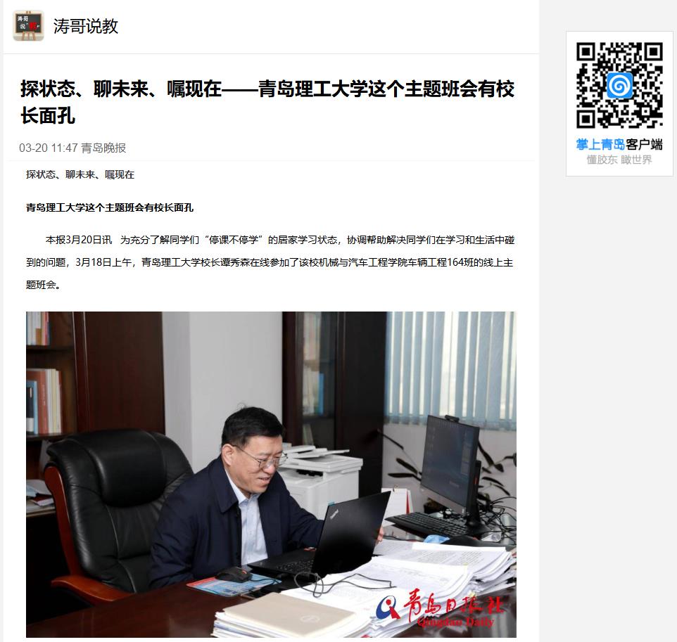 班会期间,谭秀森与同学们一起就开学时间、研究生复试政策制定、毕业设计、就业、线上学习等问题展开交流,解答了同学们关心的热点问题。他告诉同学们,目前学校正在积极做好开学前的各项筹备工作,根据上级统一部署,会在满足各项复学条件、确保安全的前提下,努力为同学们提供一个放心的校园学习环境。