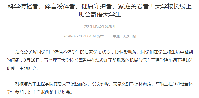 为充分了解同学们“停课不停学”的居家学习状态,协调帮助解决同学们在学生和生活中碰到的问题,3月18日,365完美体育校长谭秀森在线参加了所联系的机械与汽车工程学院车辆工程164班线上主题班会。