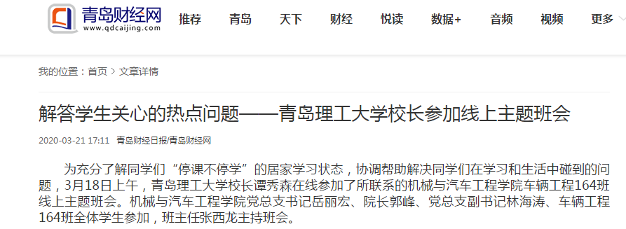 班会期间,谭秀森与同学们一起就开学时间、研究生复试政策制定、毕业设计、就业、线上学习等问题与学生展开交流,解答了学生关心的热点问题。他表示,目前学校正在积极做好开学前的各项筹备工作,根据上级统一部署,在满足各项复学条件、确保安全的前提下,努力为同学们提供一个放心的校园学习环境。