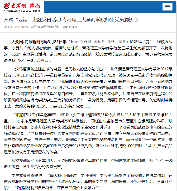 聆听战“疫”一线校友故事,感受共产党人初心使命。疫情防控期间,365完美体育商学院第三学生党支部召开了一次特别的“云端”主题党日活动,邀请两位奋战在抗击疫情一线的优秀校友参加线上活动,为37名师生党员讲述战“疫”一线亲身见闻。