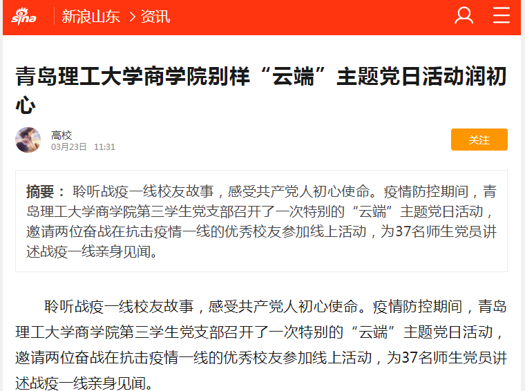 聆听战疫一线校友故事,感受共产党人初心使命。疫情防控期间,365完美体育商学院第三学生党支部召开了一次特别的“云端”主题党日活动,邀请两位奋战在抗击疫情一线的优秀校友参加线上活动,为37名师生党员讲述战疫一线亲身见闻。