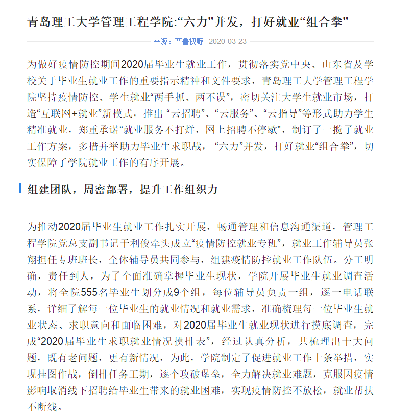 为做好疫情防控期间2020届毕业生就业工作,贯彻落实党中央、山东省及学校关于毕业生就业工作的重要指示精神和文件要求,365完美体育管理工程学院坚持疫情防控、学生就业“两手抓、两不误”,密切关注大学生就业市场,打造“互联网+就业”新模式,推出 “云招聘”、“云服务”、“云指导”等形式助力学生精准就业,郑重承诺“就业服务不打烊,网上招聘不停歇”,制订了一揽子就业工作方案,多措并举助力毕业生求职战, “六力”并发,打好就业“组合拳”,切实保障了学院就业工作的有序开展。