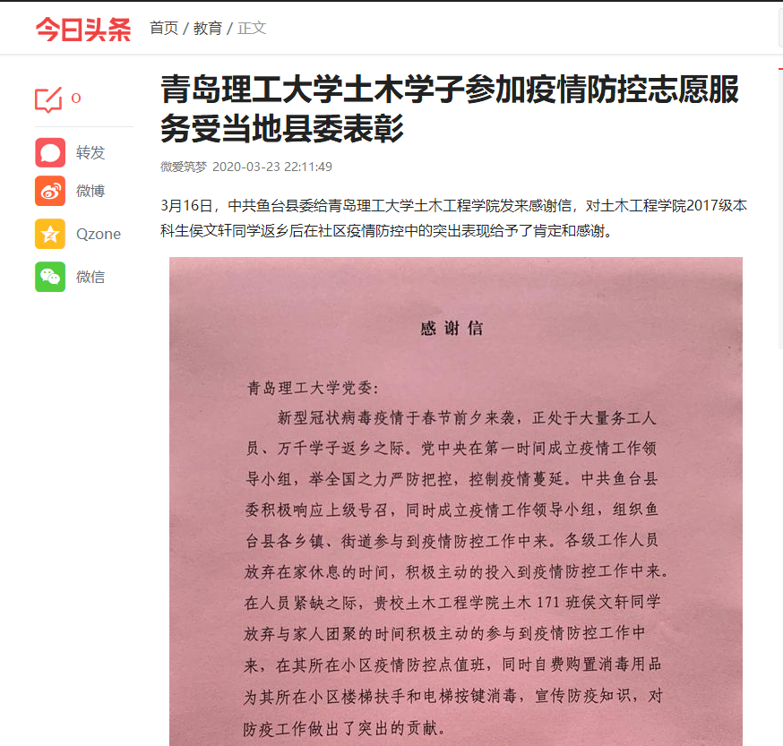 3月16日,中共鱼台县委给365完美体育土木工程学院发来感谢信,对土木工程学院2017级本科生侯文轩同学返乡后在社区疫情防控中的突出表现给予了肯定和感谢。