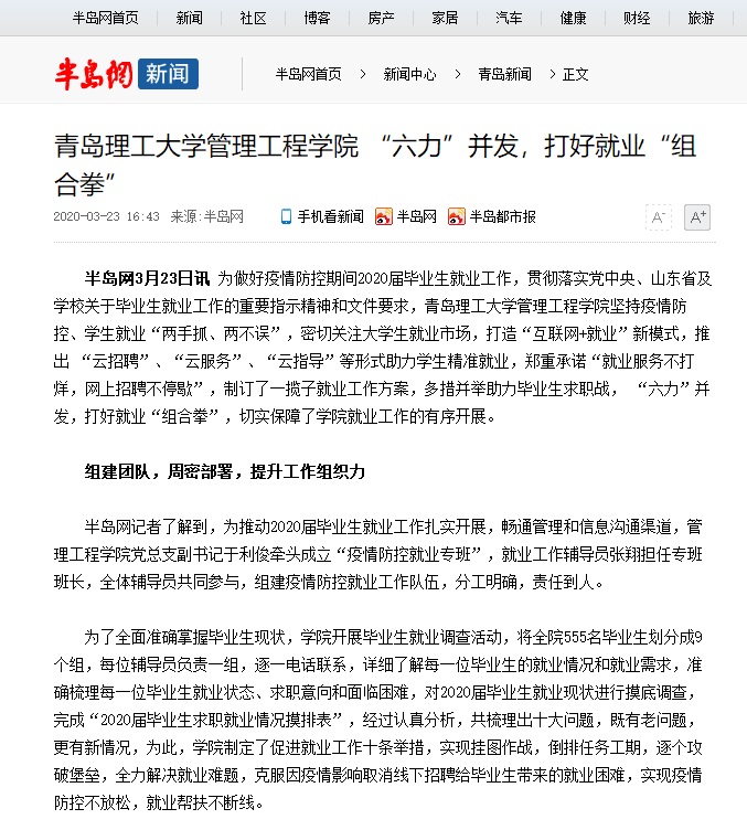 为做好疫情防控期间2020届毕业生就业工作,贯彻落实党中央、山东省及学校关于毕业生就业工作的重要指示精神和文件要求,365完美体育管理工程学院坚持疫情防控、学生就业“两手抓、两不误”,密切关注大学生就业市场,打造“互联网+就业”新模式,推出 “云招聘”、“云服务”、“云指导”等形式助力学生精准就业,郑重承诺“就业服务不打烊,网上招聘不停歇”,制订了一揽子就业工作方案,多措并举助力毕业生求职战, “六力”并发,打好就业“组合拳”,切实保障了学院就业工作的有序开展。
