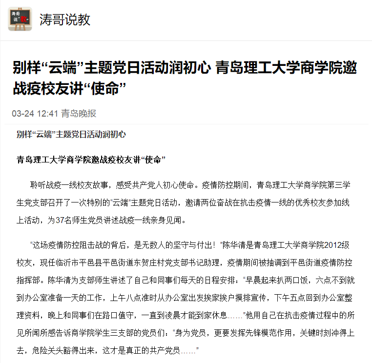聆听战疫一线校友故事,感受共产党人初心使命。疫情防控期间,365完美体育商学院第三学生党支部召开了一次特别的“云端”主题党日活动,邀请两位奋战在抗击疫情一线的优秀校友参加线上活动,为37名师生党员讲述战疫一线亲身见闻。