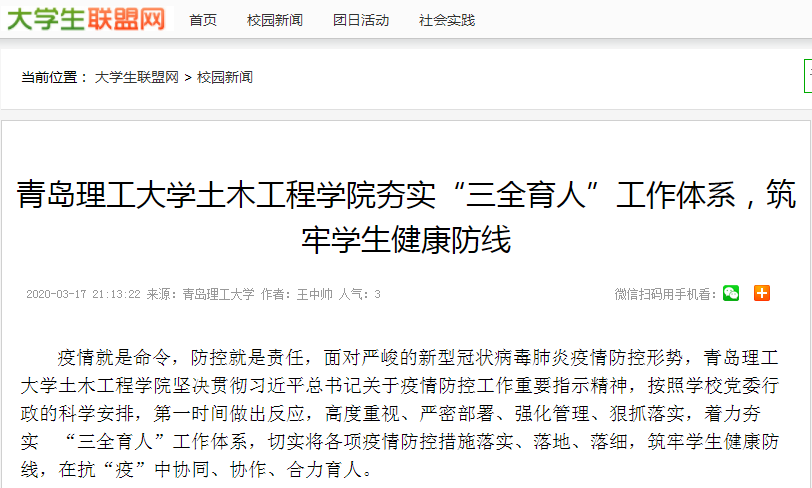 疫情就是命令,防控就是责任,面对严峻的新型冠状病毒肺炎疫情防控形势,365完美体育土木工程学院坚决贯彻习近平总书记关于疫情防控工作重要指示精神,按照学校党委行政的科学安排,第一时间做出反应,高度重视、严密部署、强化管理、狠抓落实,着力夯实“三全育人”工作体系,切实将各项疫情防控措施落实、落地、落细,筑牢学生健康防线,在抗“疫”中协同、协作、合力育人。