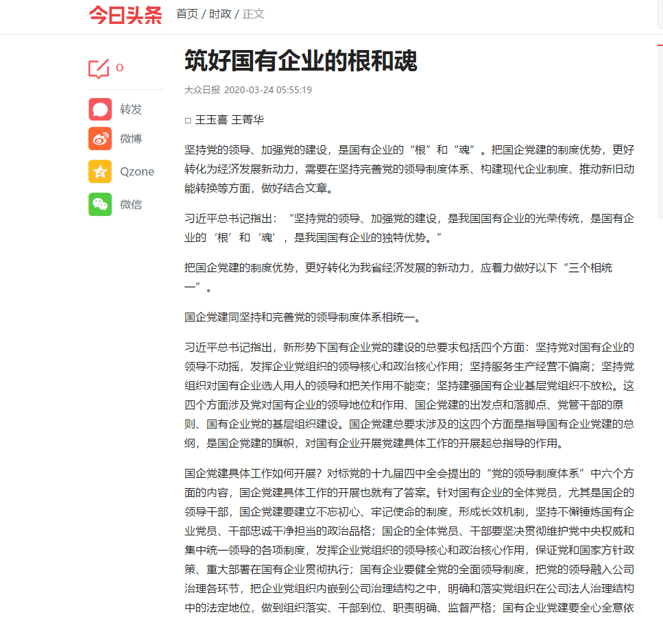 坚持党的领导、加强党的建设,是国有企业的“根”和“魂”。把国企党建的制度优势,更好转化为经济发展新动力,需要在坚持完善党的领导制度体系、构建现代企业制度、推动新旧动能转换等方面,做好结合文章。