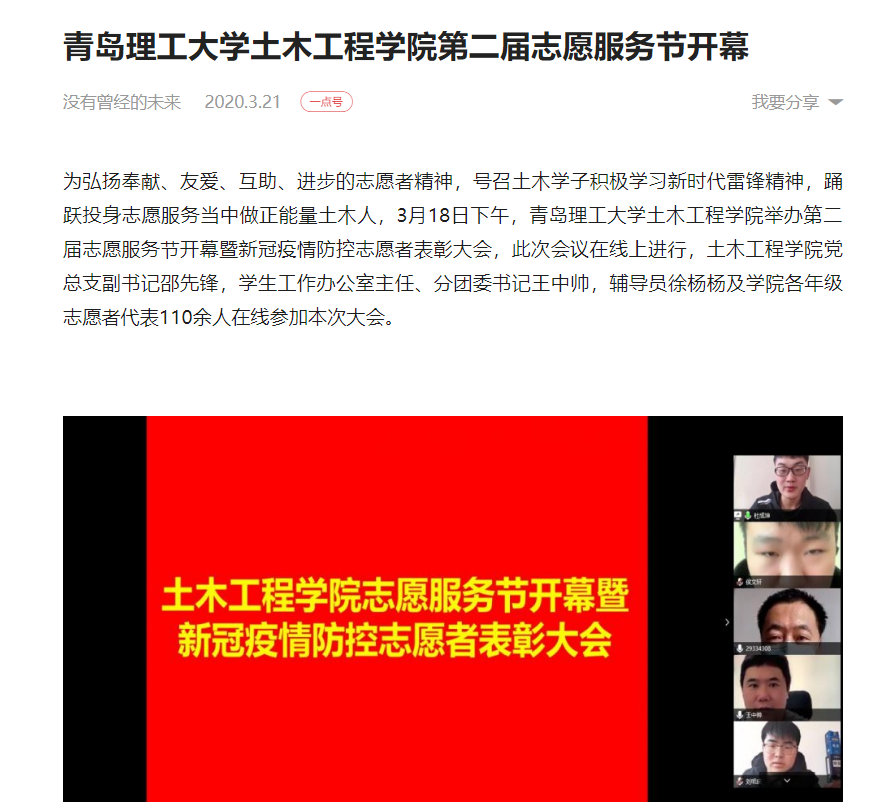 为弘扬奉献、友爱、互助、进步的志愿者精神,号召土木学子积极学习新时代雷锋精神,踊跃投身志愿服务当中做正能量土木人,3月18日下午,365完美体育土木工程学院举办第二届志愿服务节开幕暨新冠疫情防控志愿者表彰大会,此次会议在线上进行,土木工程学院党总支副书记邵先锋,学生工作办公室主任、分团委书记王中帅,辅导员徐杨杨及学院各年级志愿者代表110余人在线参加本次大会。