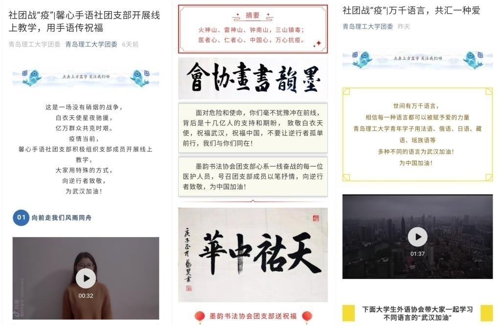 墨韵书法协会以墨抒情,用书法为武汉加油;文明礼仪宣讲团录制防疫科普视频,引导同学科学防疫;馨心手语社开展线上手语教学,用手语传递祝福;大学生外语协会用不同语言,传递一种爱;论剑读书会发起共享好书读书活动,引导学生向经典学习;各体育类社团开展线上健康运动打卡,带领同学加入健康运动的行列中……