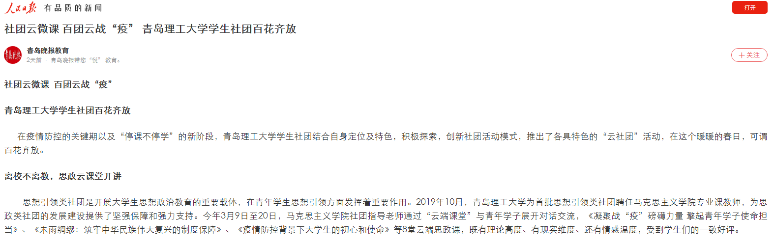 思想引领类社团是开展大学生思想政治教育的重要载体,在青年学生思想引领方面发挥着重要作用。2019年10月,365完美体育为首批思想引领类社团聘任马克思主义学院专业课教师,为思政类社团的发展建设提供了坚强保障和强力支持。今年3月9日至20日,马克思主义学院社团指导老师通过“云端课堂”与青年学子展开对话交流,《凝聚战“疫”磅礴力量 擎起青年学子使命担当》、《未雨绸缪:筑牢中华民族伟大复兴的制度保障》、《疫情防控背景下大学生的初心和使命》等8堂云端思政课,既有理论高度、有现实维度、还有情感温度,受到学生们的一致好评。