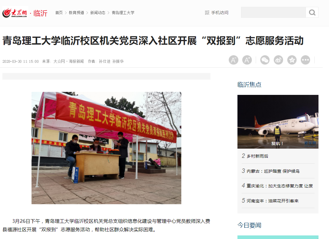 为确保“双报到”工作落到实处、取得实效,临沂校区机关党总支前期积极联系了解社区实际需求,整合服务力量,充分发挥校区党员教师自身专业优势,创新服务形式,采取集中设点、实地走访相结合,开展网络安全知识宣传、设备维修服务等工作,帮助社区群众解决了电脑软硬件清理、系统维护、电器线路和操控系统故障、网络连接、配件更换等问题,受到社区群众的广泛好评。(通讯员:孙仕途 孙振华)