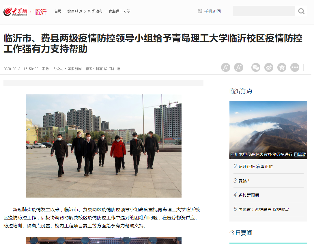临沂市、费县两级疫情处置工作领导小组对临沂校区疫情防控工作的有力支持,进一步坚定了临沂校区师生战胜疫情的信心和决心。春暖花开,开学在即。临沂校区将积极稳妥做好学生复学返校各项准备工作,强力推进校区各项事业全面发展,奋力夺取疫情防控和实现校区高质量发展双胜利。临沂校区将始终牢记“扎根革命老区,办沂蒙人民满意大学”的历史使命,主动担当作为,服务大美新临沂建设,以实际行动回馈当地政府和人民的关怀帮助。(通讯员:孙仕途;撰稿:陈丽华)