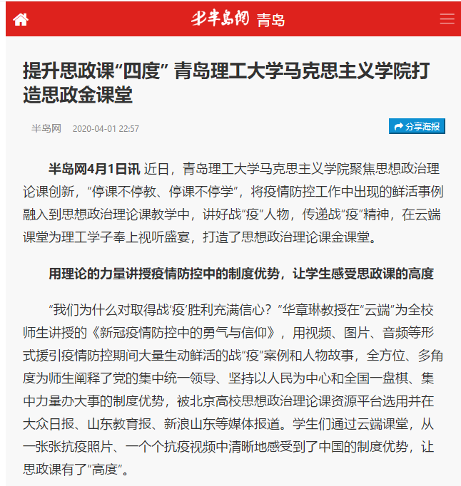 “我们为什么对取得战‘疫’胜利充满信心?”华章琳教授在“云端”为全校师生讲授的《新冠疫情防控中的勇气与信仰》,用视频、图片、音频等形式援引疫情防控期间大量生动鲜活的战“疫”案例和人物故事,全方位、多角度为师生阐释了党的集中统一领导、坚持以人民为中心和全国一盘棋、集中力量办大事的制度优势,被北京高校思想政治理论课资源平台选用并在大众日报、山东教育报、新浪山东等媒体报道。学生们通过云端课堂,从一张张抗疫照片、一个个抗疫视频中清晰地感受到了中国的制度优势,让思政课有了“高度”。