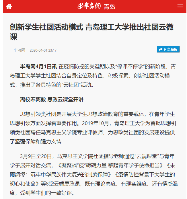 半岛网记者了解到,“云端小课堂”分为班级、院级、校级三种模式,仅3月10日至20日,校级“云端小课堂”开讲6次,500余名学生参加听讲,现各班级、院级“云端小课堂”也在有序推进。希望通过“云端小课堂”,将爱国主义教育和实践活动开展到每一个支部,影响到每一名同学。