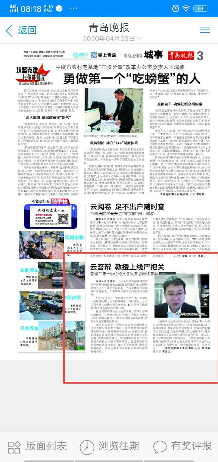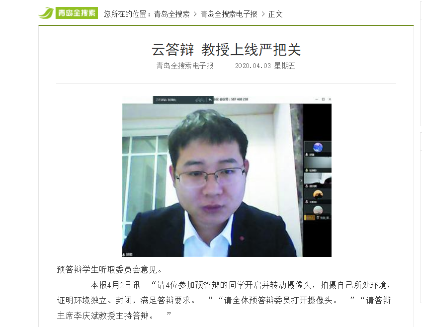“感谢学校及各位专家的关心指导!第一次经历这种新颖独特的答辩形式,非常有纪念意义! ”答辩结束后,陈际洲同学兴奋地说,疫情虽然影响了人们的生活,但学校尽最大努力创造条件,最大程度地保证了这届博士研究生顺利毕业。他认为,相比于传统的线下答辩形式,云答辩能够自主选择最佳的环境,全身心投入到答辩环节中,同时,云答辩形式方便专家、旁听者全程收看,互动充分。 (青岛晚报/掌上青岛/青网 记者 杨海涛通讯员 曹玉洁)