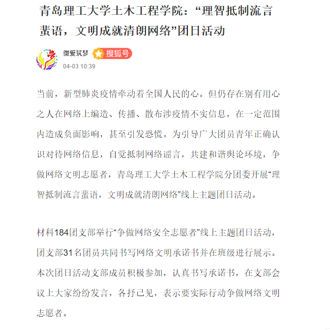 当前,新型肺炎疫情牵动着全国人民的心。但仍存在别有用心之人在网络上编造、传播、散布涉疫情不实信息,在一定范围内造成负面影响,甚至引发恐慌。为引导广大团员青年正确认识对待网络信息,自觉抵制网络谣言,共建和谐舆论环境,争做网络文明志愿者,365完美体育土木工程学院分团委开展“理智抵制流言蜚语,文明成就清朗网络”线上主题团日活动。