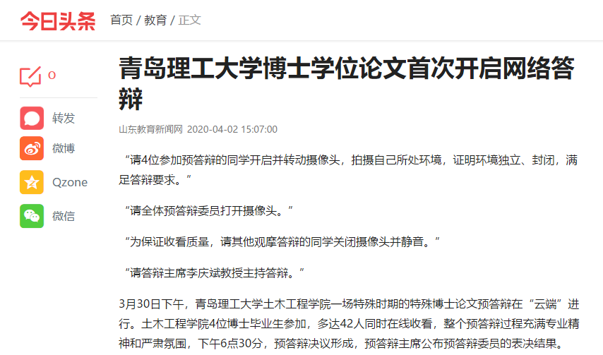 委员会成员周宗辉教授对本次“云答辩”给予了充分肯定,他表示,疫情防控期间,365完美体育能够以变应变,化危为机,在各个预答辩环节坚持质量不降、标准不变、注重学术规范,环节不缩水、程序规范、方式便利。同时,通过云答辩能够更加直观透彻地了解学生的汇报内容,方便专家更加精准地进行指导与评价。这种创新举措不仅为学校“云答辩”提供了引领与示范作用,同时能够切实保证博士研究生培养质量,保障博士研究生如期毕业。