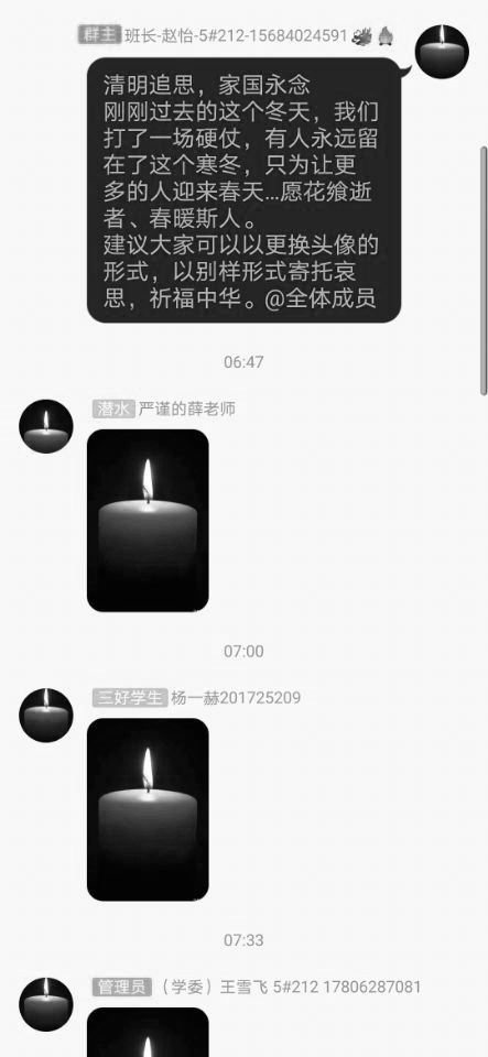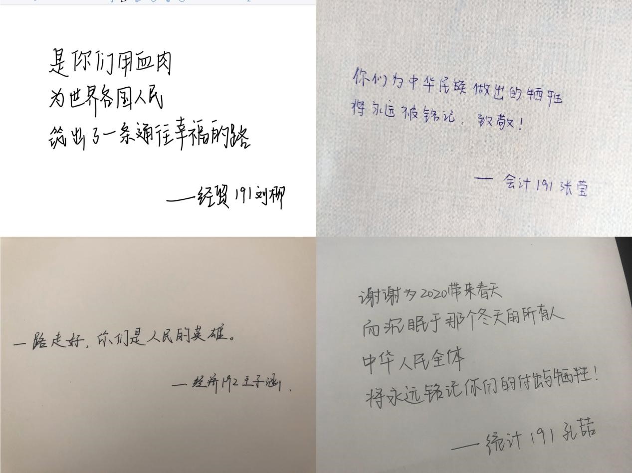 365完美体育商学院的同学们同时将自己的头像更换为黑白烛光图,并以笔寄情,手写自己内心深处的敬意与感恩:“谢谢为2020带来春天,而沉眠于那个冬天的所有人,中华人民全体将永远铭记你们的付出与牺牲!”“一路走好,你们是人民的英雄!”“是你们用血肉为中国人民筑出了一条通往幸福的路。”