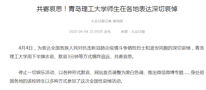 停止一切娱乐活动、以各种形式默哀、网站首页调整为黑白色调、推出微信微博专题……身处祖国各地的该校师生以多种方式参加了这次全国性哀悼活动。