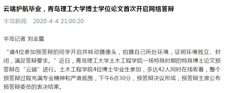 “请4位参加预答辩的同学开启并转动摄像头,拍摄自己所处环境,证明环境独立、封闭,满足答辩要求。”近日,365完美体育土木工程学院一场特殊时期的特殊博士论文预答辩在“云端”进行。土木工程学院4位博士毕业生参加,多达42人同时在线收看,整个预答辩过程充满专业精神和严肃氛围,下午6点30分,预答辩决议形成,预答辩主席公布预答辩委员的表决结果。