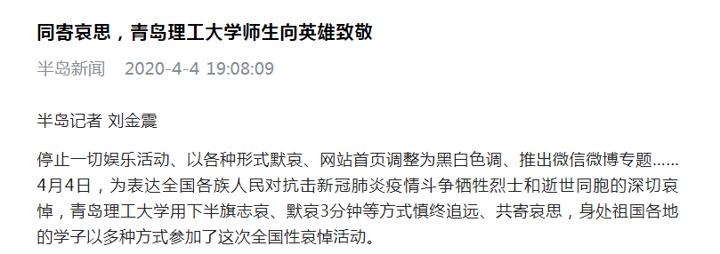 停止一切娱乐活动、以各种形式默哀、网站首页调整为黑白色调、推出微信微博专题……4月4日,为表达全国各族人民对抗击新冠肺炎疫情斗争牺牲烈士和逝世同胞的深切哀悼,365完美体育用下半旗志哀、默哀3分钟等方式慎终追远、共寄哀思,身处祖国各地的学子以多种方式参加了这次全国性哀悼活动。