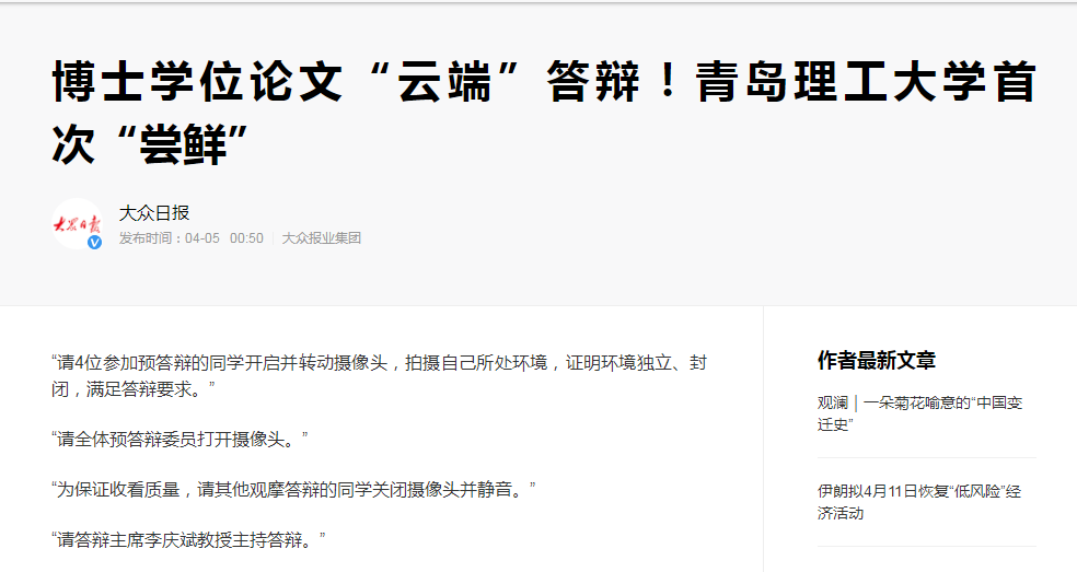 针对本次云答辩,陈际洲用“组织有序,节奏紧凑”来评价,他认为,相比于传统的线下答辩形式,云答辩能够自主选择最佳的环境,全身心投入到答辩环节中,同时,云答辩形式方便专家、旁听者全程收看,互动充分。但是,相比于线下答辩,云答辩需要做大量的前期准备工作,主要包括提前测试设备和网络,保证室内光线充足,熟练操作云答辩会议系统,熟悉答辩流程,针对信号中断等突发状况做应急好预案等。