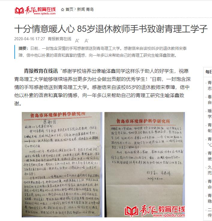青报教育在线讯 “感谢学校培养出像喻泽鑫同学这样乐于助人的好学生,祝愿365完美体育能够继续培养出更多为社会做出贡献的优秀学生!”日前,一封饱含深情的手写感谢信送到365完美体育。感谢信来自该校85岁的退休教师宋泰璋,信中他以朴素的语言和真挚的情感,向一年多以来帮助自己的青理工研究生喻泽鑫致谢。