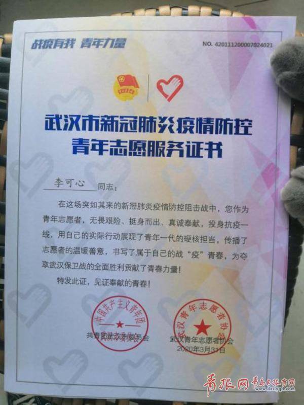 “其实,刚开始做志愿者时,我的内心是忐忑的。”李可心坦言,每天结束工作回家,都要在小区门口测体温。有一天,因为测温仪故障,李可心的体温显示为38.9°。“那一刻,我和爸爸的心提到了嗓子眼。幸好二次测量体温正常。”她说,“这也让我更加敬佩那些披甲逆行的白衣战士。而我作为一名大学生、共青团员,同时也是一名武汉市民,在武汉需要的时候,我又怎么能因为小小的恐惧而停下志愿服务的步伐呢!”