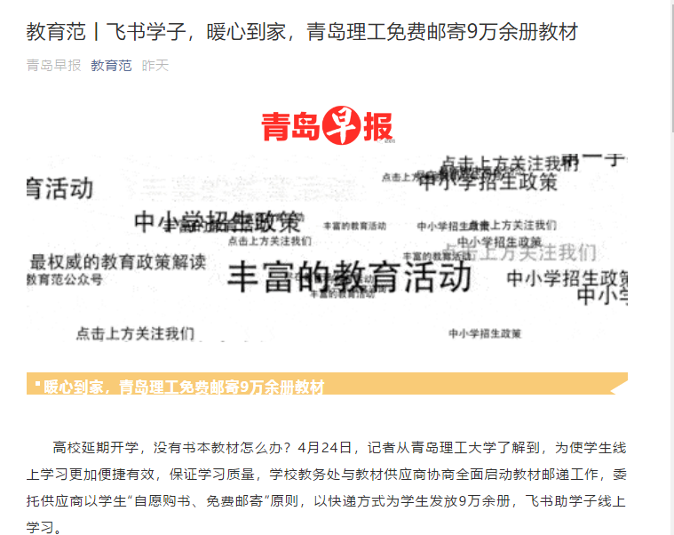 记者了解到,此前学校临沂校区分批次向190个班、4961名学生邮寄教材22468册。近日,青岛校区为自愿申请购书的13144名同学邮寄67936册教材,包括偏远地区(新疆、西藏、甘肃等)、湖北地区的同学均已收到教材,实现“邮寄教材到家助力线上教学”。