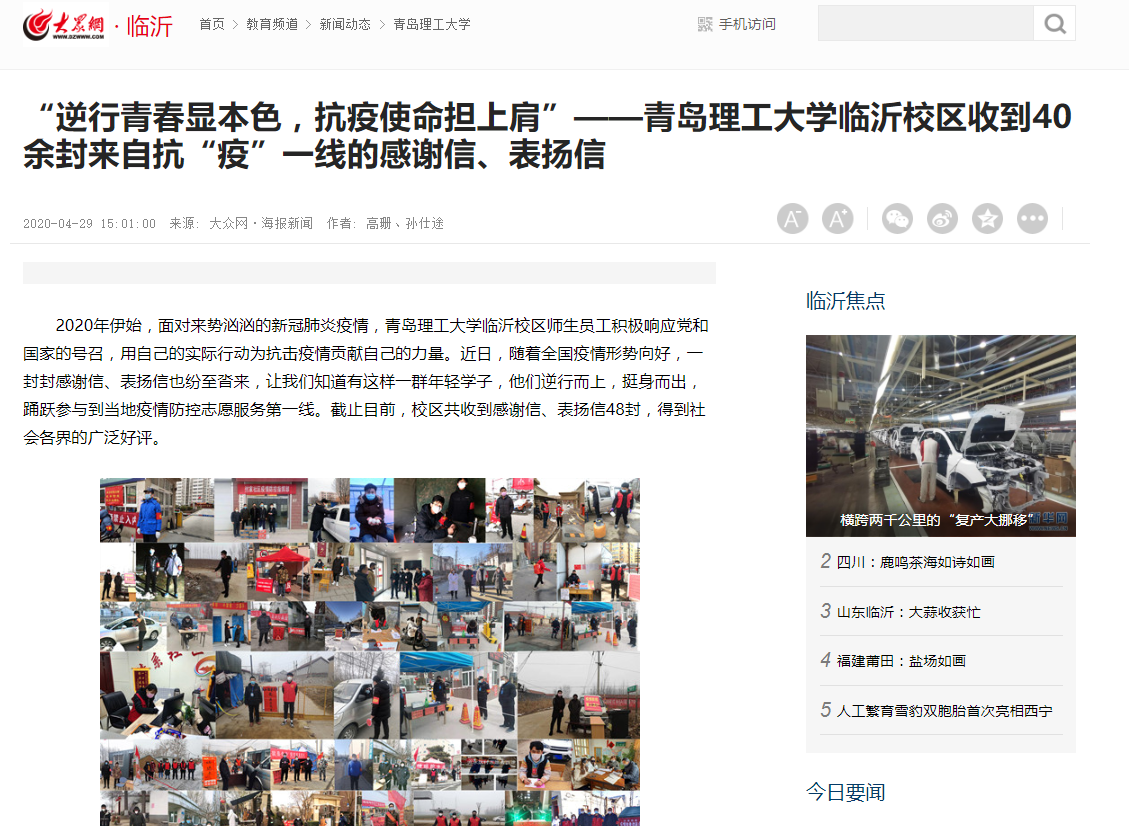 感谢信中还记录了一些真实具体的动人故事。中共莱西市水集街道办事处大疃村党支部来信记载了临沂校区土木与建筑工程系土木工程专业1910班姜青林同学在身为党员的父亲带动下,父子上阵抗疫的故事,信中写到:“我村共产党员姜良家的儿子姜青林同志,在2020年春节期间,也就正月初二,听到他爸爸回家说抗击疫情共产党员要冲锋在前,便主动找到村党支部书记申请加入抗击疫情志愿者,每日按时到本村抗疫检查站协助工作,连续工作65天,在他的带动下不少青年加入了抗击疫情第一线。”梁山县大路口村党支部的来信记载了临沂校区土木与建筑工程系工程监理专业182班学生张鑫鑫“自2020年1月27日(正月初三)以来,每天24小时值守本村防控点”,连续昼夜奋战在防控一线的感人事迹。