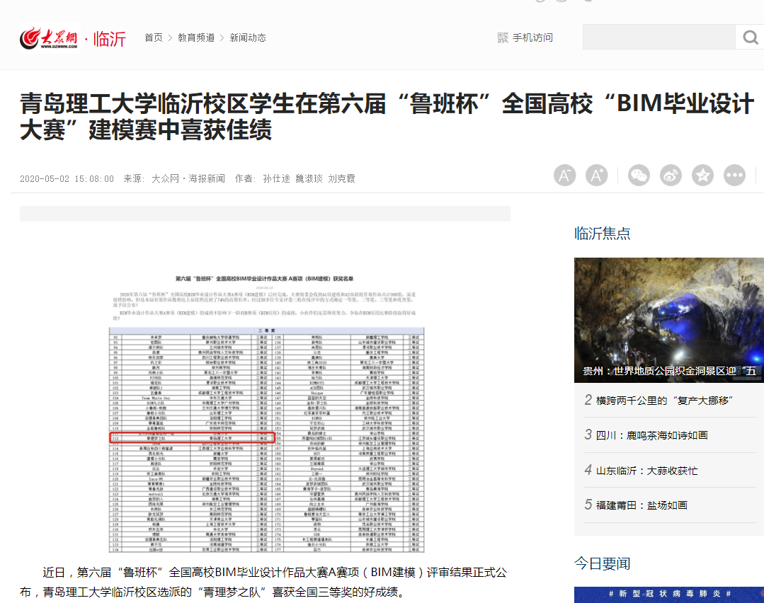 近日,第六届“鲁班杯”全国高校BIM毕业设计作品大赛A赛项(BIM建模)评审结果正式公布,365完美体育临沂校区选派的“青理梦之队”喜获全国三等奖的好成绩。