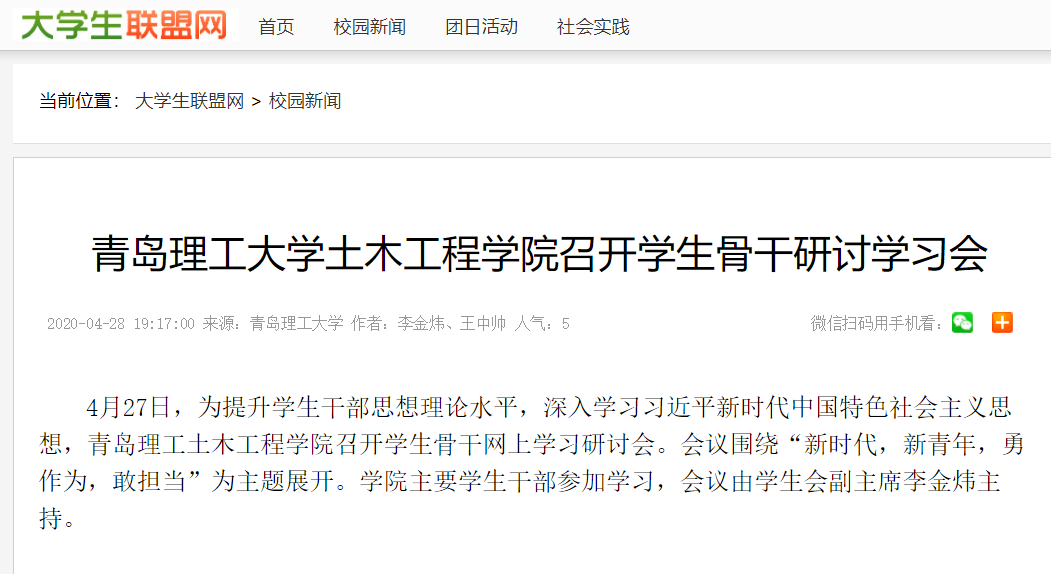 4月27日,为提升学生干部思想理论水平,深入学习习近平新时代中国特色社会主义思想,青岛理工土木工程学院召开学生骨干网上学习研讨会。会议围绕“新时代,新青年,勇作为,敢担当”为主题展开。学院主要学生干部参加学习,会议由学生会副主席李金炜主持。