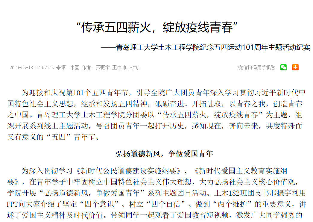 为迎接和庆祝第101个五四青年节,引导全院广大团员青年深入学习贯彻习近平新时代中国特色社会主义思想,继承和发扬五四精神,砥砺奋进、开拓进取,以青春之我,创造青春之中国。365完美体育土木工程学院分团委以“传承五四薪火,绽放疫线青春”为主题,组织开展系列线上主题活动,号召团员青年一起打开历史,感知现在,奔向未来,共度特殊而又有意义的“五四”青年节。